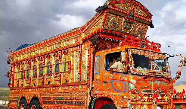 What began as a way for drivers to express pride in their trucks has evolved into a world-famous folk art style. Bursting with floral motifs, vivid birds like peacocks, calligraphy, portraits of heroes, and religious symbols each truck is uniquely personal.